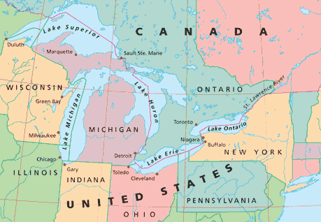 NOAA Great Lakes Map Showing Cities, States and Provinces