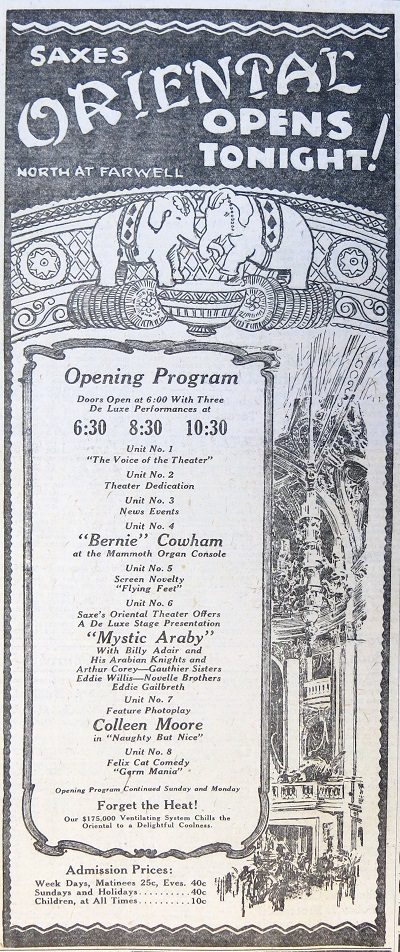 To find out more about the Oriental, Saxe chain, and other Milwaukee movie theaters, start with Widen's Silver Screens and Milwaukee Movie Theaters.